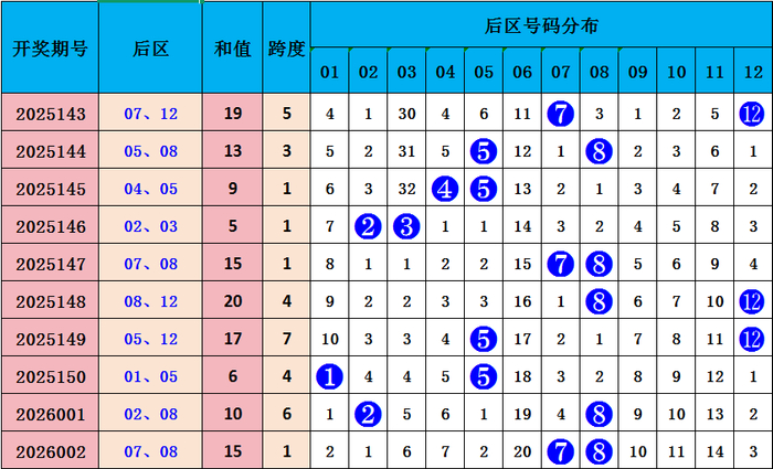 上期后区开出号码07 08,和值10,近十期和值19 13 9 5 15 20 17 6 10 15,和值波动规模较大,本期预测和值会飞腾,重款式切号码:05 12,和值17。