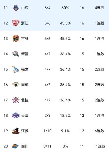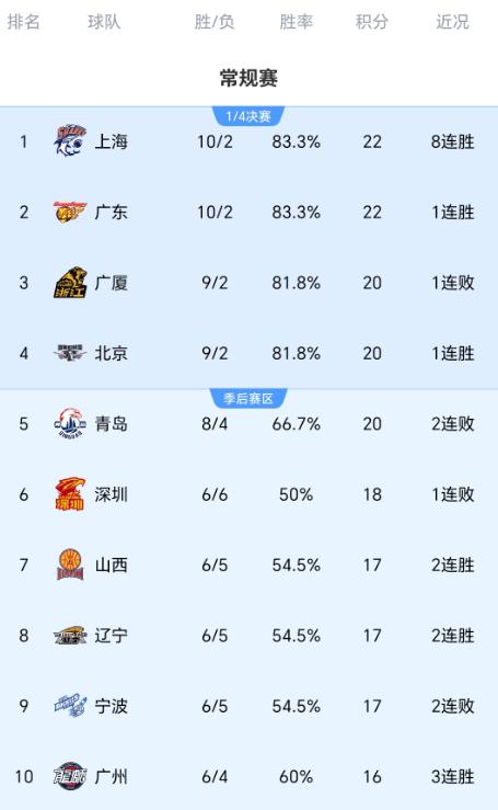 前十一轮事后,广厦队、上海队、北京队、广东队分列积分榜前四名,恰巧的是,以上四队的战绩王人是9胜2负。