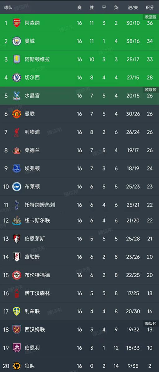 当今前三名的球队永诀是阿森纳,本轮2-1投降了狼队,以36分领跑。曼城本轮3-0轻打水晶宫迎来4连胜,当今以34分暂列第二,只逾期枪手2分。阿斯顿维拉3-2绝杀联,畴昔13轮只是输掉1场,当今以33分暂列第三。倒数后三名的球队永诀是西汉姆联13分,伯恩利10分,狼队2分。