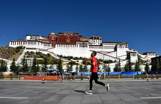 10月16日,选手在比赛中经由布达拉宫。新华社记者陈尚才摄