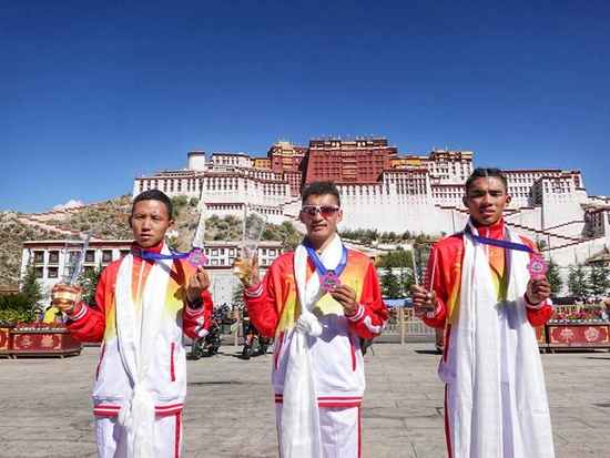 10月16日,男人组冠军索朗才仁(中)、亚军旦木真次旺(左)和季军扎西次仁在比赛后的受奖庆典上。新华社记者司源摄