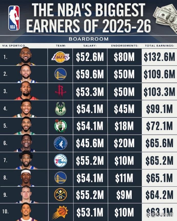 2025-26赛季,NBA收入最高的球员当中,詹姆斯的年薪高达5260万好意思元,买卖收入8000万好意思元,认为1.326亿好意思元高居第一。库里年薪高达5960万好意思元,买卖收入5000万好意思元,认为1.096亿好意思元,名纪律二。杜兰特年薪高达5330万好意思元,买卖收入5000万好意思元,总收入1.033亿好意思元,名纪律三。