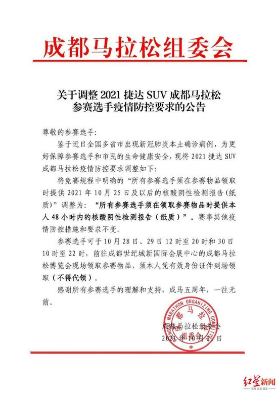 成马组委会在10月21日发布“对于调理2021捷达SUV成齐马拉松参赛选手疫情防控条款的公告”,此前成马竞赛规程中提到“总计参赛选手须在参赛物品领取时提供2021年10月25日及以后的核酸阴性检测敷陈(纸质)”。但鉴于近日来宇宙多省市出现新冠肺炎原土确诊病毒,为更好保险参赛选手和市民的生命健康安全,成马组委会将2021捷达SUV成齐马拉松疫情防控调理为:总计参赛选手须在领取参赛物品时提供本东谈主48小时内的核酸阴性检测敷陈(纸质)。赛事其他疫情防控要领和条款不变。