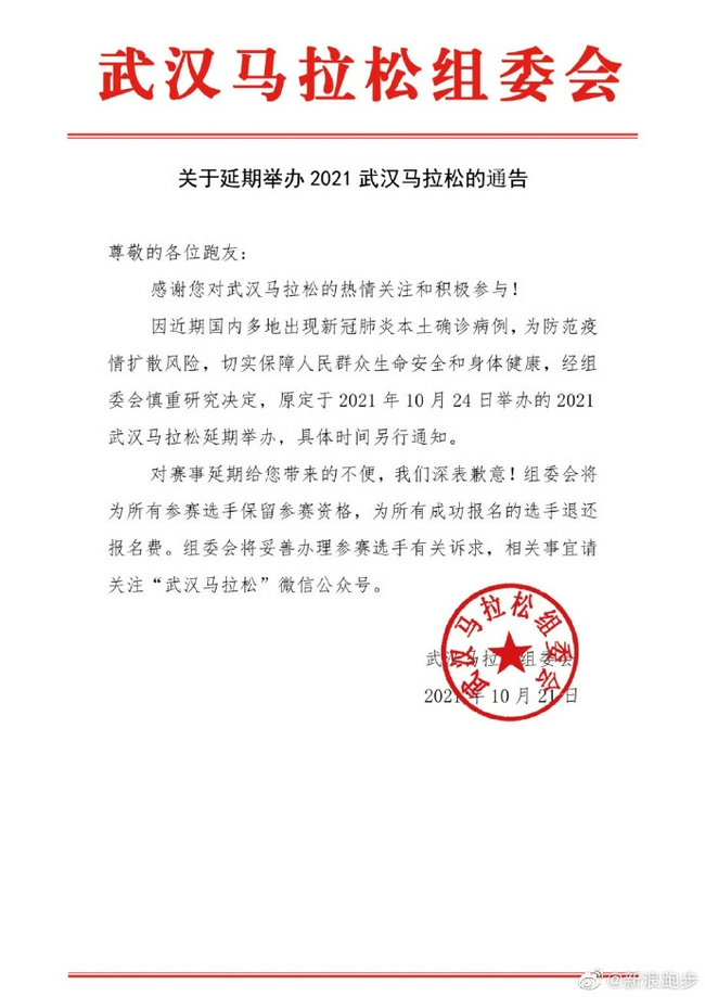 因近期国内多地出现新冠肺炎原土确诊病例,为讲求疫情扩散风险,切实保险东说念主民天下生命安全和体格健康,经组委会把稳盘算推算决定,原定于2021年10月24日举办的2021武汉马拉松延期举办,具体技艺另行告知。