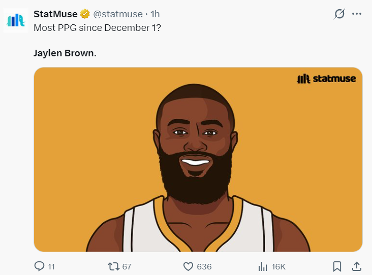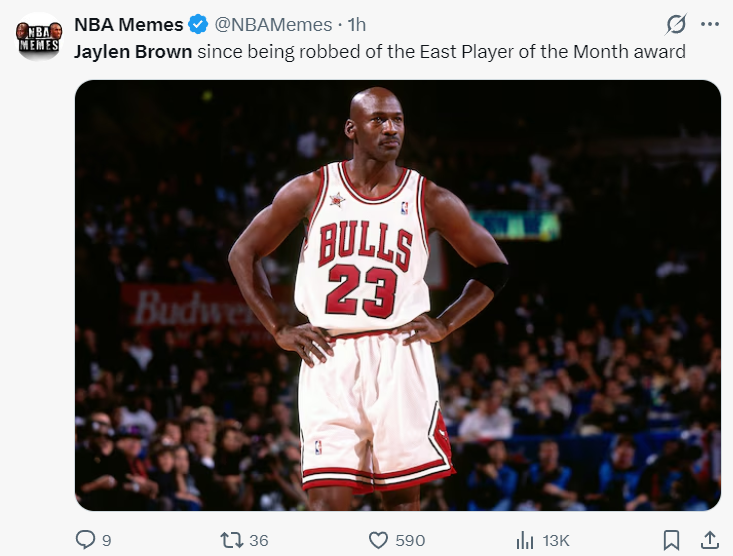 好意思媒NBA Memes写谈:当杰伦-布朗的月最好球员被抢走后,他就化身迈克尔-乔丹了。