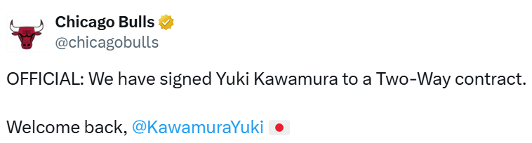 河村勇辉曾在旧年7月20日与公牛签下过一份双向协议,但在10月18日被裁,没能插足球队的新赛季雅致大名单。不外,此次重回芝加哥,也算是弥补了此前的缺憾。