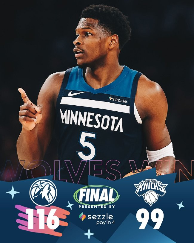 爱德华兹三分13中8轰下36分13篮板7助攻率队取胜,里德替补出场三分6中6砍下23分8篮板,丛林狼取胜后排行西部第八。