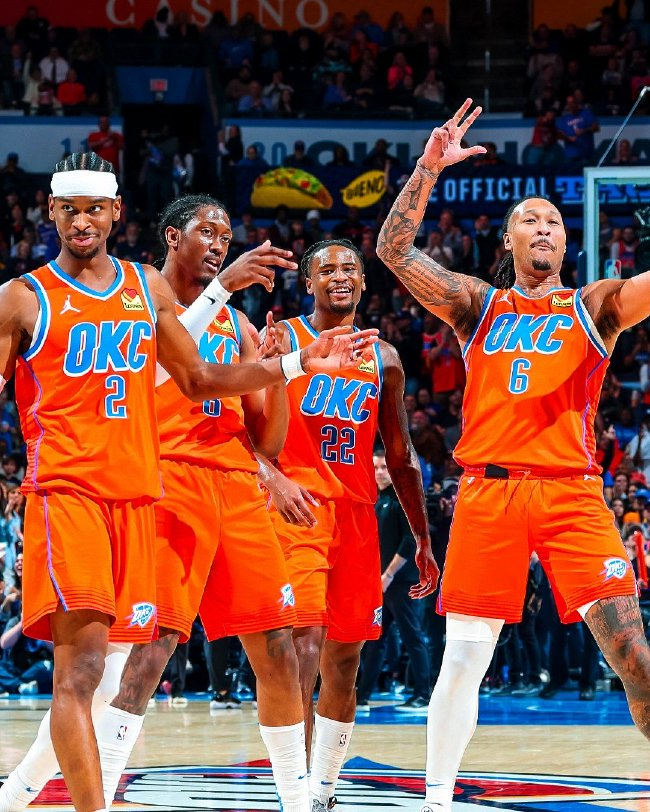 雷霆(34-6):亚历山大40分3篮板8助攻、多特22分、杰伦-威廉姆斯19分6篮板5助攻、乔12分3篮板、卡尔森11分4篮板、卡鲁索10分