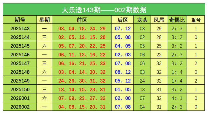 大乐透第2026002期出奖号统计:前区04、08、15、20、31,后区07、08。龙头04,凤尾31,奇偶比2:3,为开出重号。