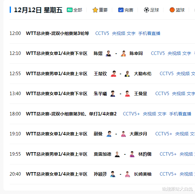 香港总决赛来到了12月12日,将迎来男、女单打1/4决赛的比拼,混双4场小组轮回赛最终轮。央视CCTV5将在12点运行直播,CCTV5+频谈在18点运行直播。国乒7场比赛6场外战,扫数来望望赛程安排。